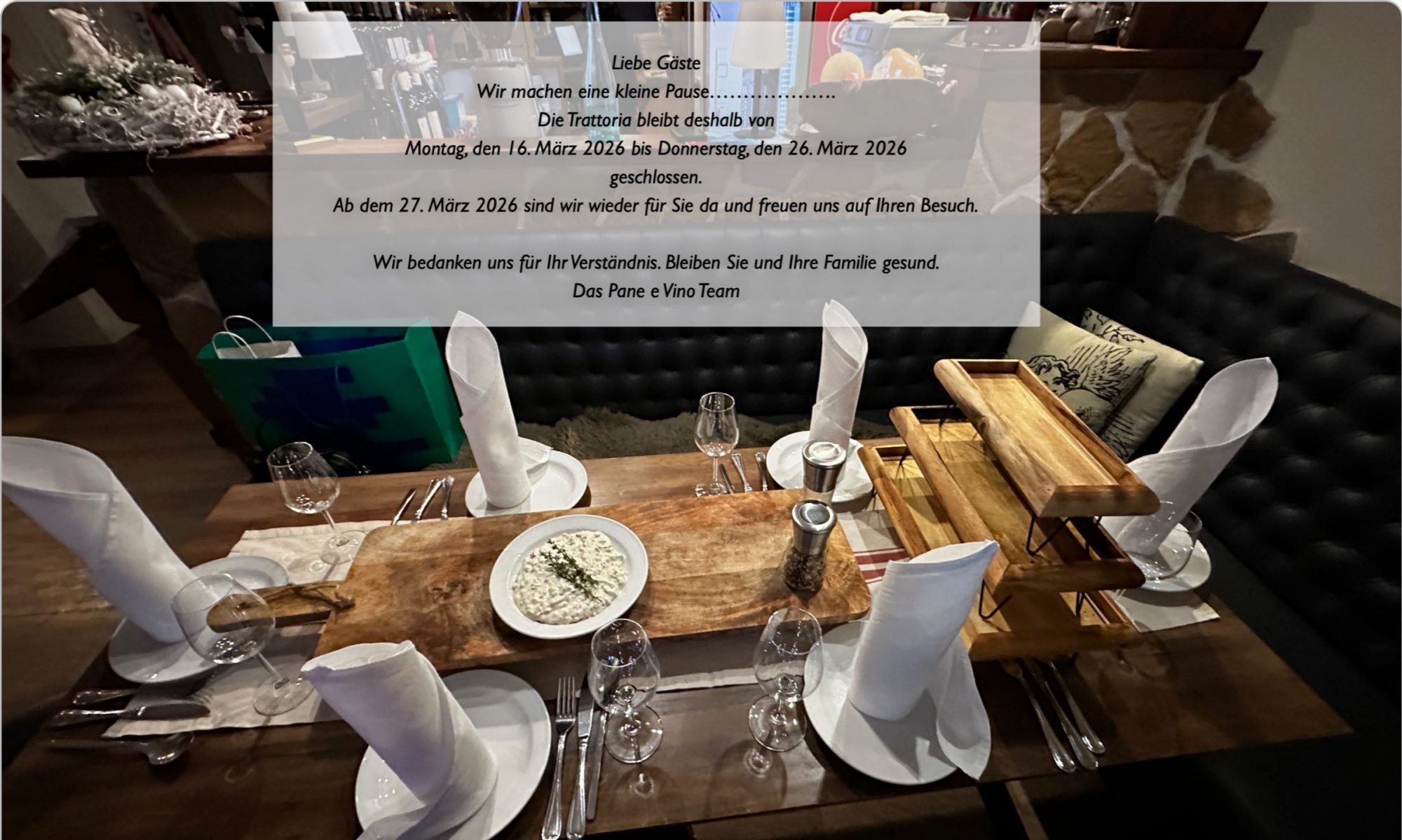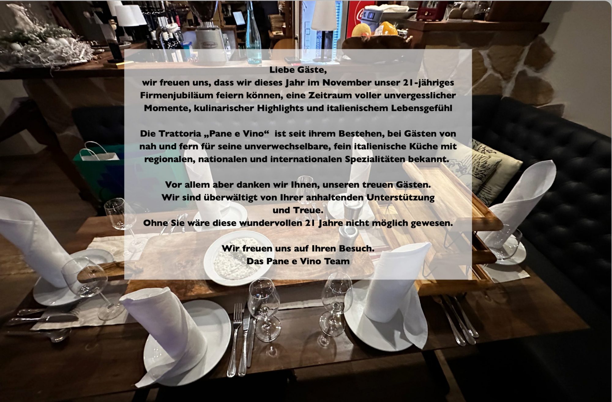 wir freuen uns, dass wir dieses Jahr im November unser 21-jähriges Firmenjubiläum feiern können, eine Zeitraum voller unvergesslicher Momente, kulinarischer Highlights und italienischem LebensgefühlDie Trattoria „Pane e Vino“ ist seit ihrem Bestehen, bei Gästen von nah und fern für seine unverwechselbare, fein italienische Küche mit regionalen, nationalen und internationalen Spezialitäten bekannt.